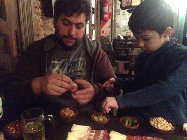 Nada que una súper picadacon platitos fríos y calientes no pueda solucionar: realmente les recomiendo este lugar, se come fabuloso, barato y la decoración del lugar no deja que la charla sea aburrida: la combinación perfecta! Eso sí: es un bar chiquito y hay que ir temprano o hacer reserva. Como fuimos con nuestros ninjas y nuestros horarios están dictados por ellos, fuimos los primeros en llegar! Amadeo inventó el chupetín de aceitunas, ya lo estamos patentando, jaja! |